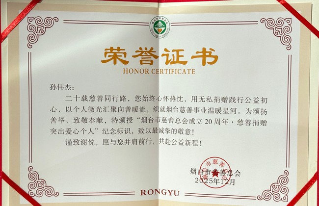 1月6日,烟台市慈善总会成立20周年庆典活动顺利召开,杰瑞股份(简称杰瑞)凭借长期在慈善领域的公益善举,荣获“慈善捐赠突出爱心单位”称号;与此同时,杰瑞联合集团董事局主席孙伟杰先生以其发起设立的“孙伟杰慈善公益基金”,积极构建起覆盖面更广、响应速度更快的公益平台,荣登“慈善捐赠突出爱心个人”名单。