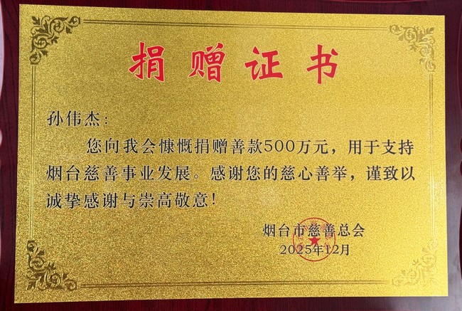 2025年6月,孙伟杰先生与杰瑞创始人王坤晓先生、刘贞峰先生共同捐赠500万元,设立“孙伟杰公益慈善基金”,用于助困、助学、助医、助残、救灾等慈善事业的开展;同年8月,烟台市慈善总会联合“杰瑞扶危济困慈善基金”为16岁藏族女孩阿旺卓玛资助医疗费用,助梦膝外翻少女“第二次起舞”;11月,杰瑞通过“孙伟杰公益慈善基金”及“杰瑞扶贫济困慈善基金”深度参与烟台市“希望工程”公益活动,为204名青少年提供教育支持。