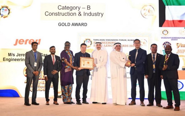 Jereh Oil & Gas Engineering Corporation received the Gold Award in the Construction & Industry category for the high-quality delivery of the Jurassic Production Facilities 5 (JPF-5) project for Kuwait Oil Company (KOC) at the 16th TEF Technological Innovations Conference & Exposition (TICE) and the 9th Engineering Excellence Awards Ceremony in Kuwait. The award, presented by senior representatives from KOC and Kuwait National Petroleum Company (KNPC), recognized Jereh’s excellence in project execution and delivery.